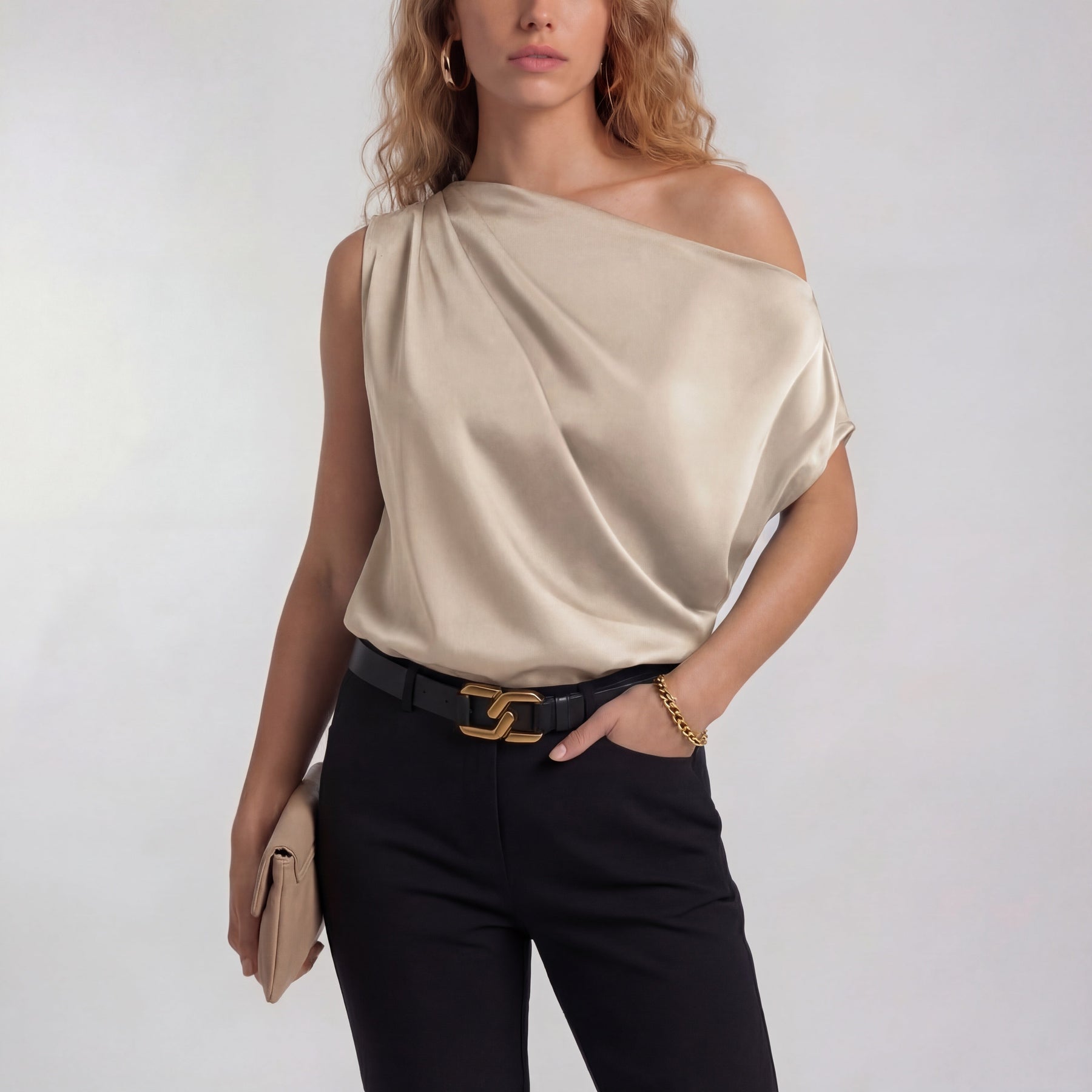 Style: One shoulder blouse with draped detail